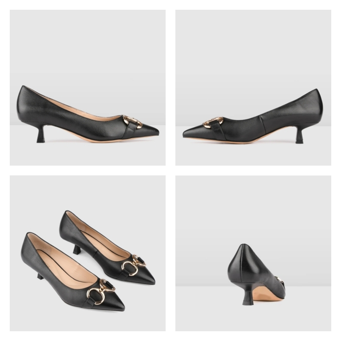 ● Features: The low heel with fine detailing that will invigorate your look. This kitten heel features a metallic vamp trim, pointed toe and squared off back heel counter.